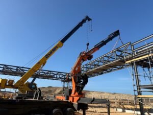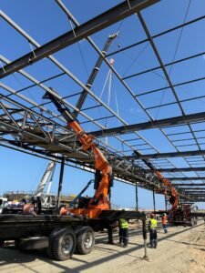 A operação foi executada com sucesso utilizando 3 caminhões com guindaste articulado (tipo munck) e 1 guindaste auxiliar, permitindo a instalação das estruturas com segurança, reduzindo significativamente o tempo de execução e os riscos associados ao trabalho em altura.